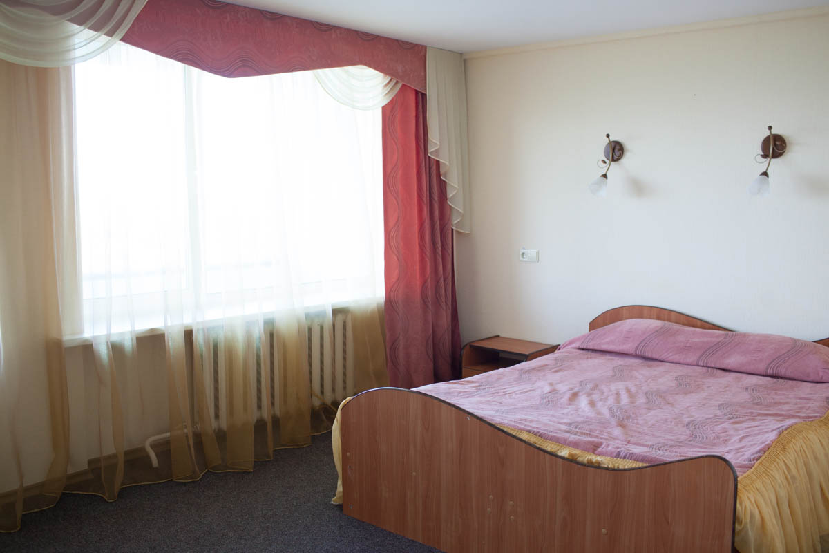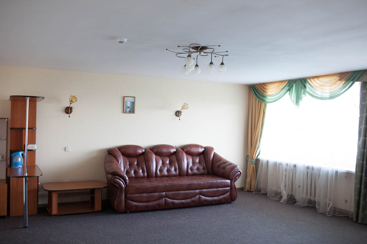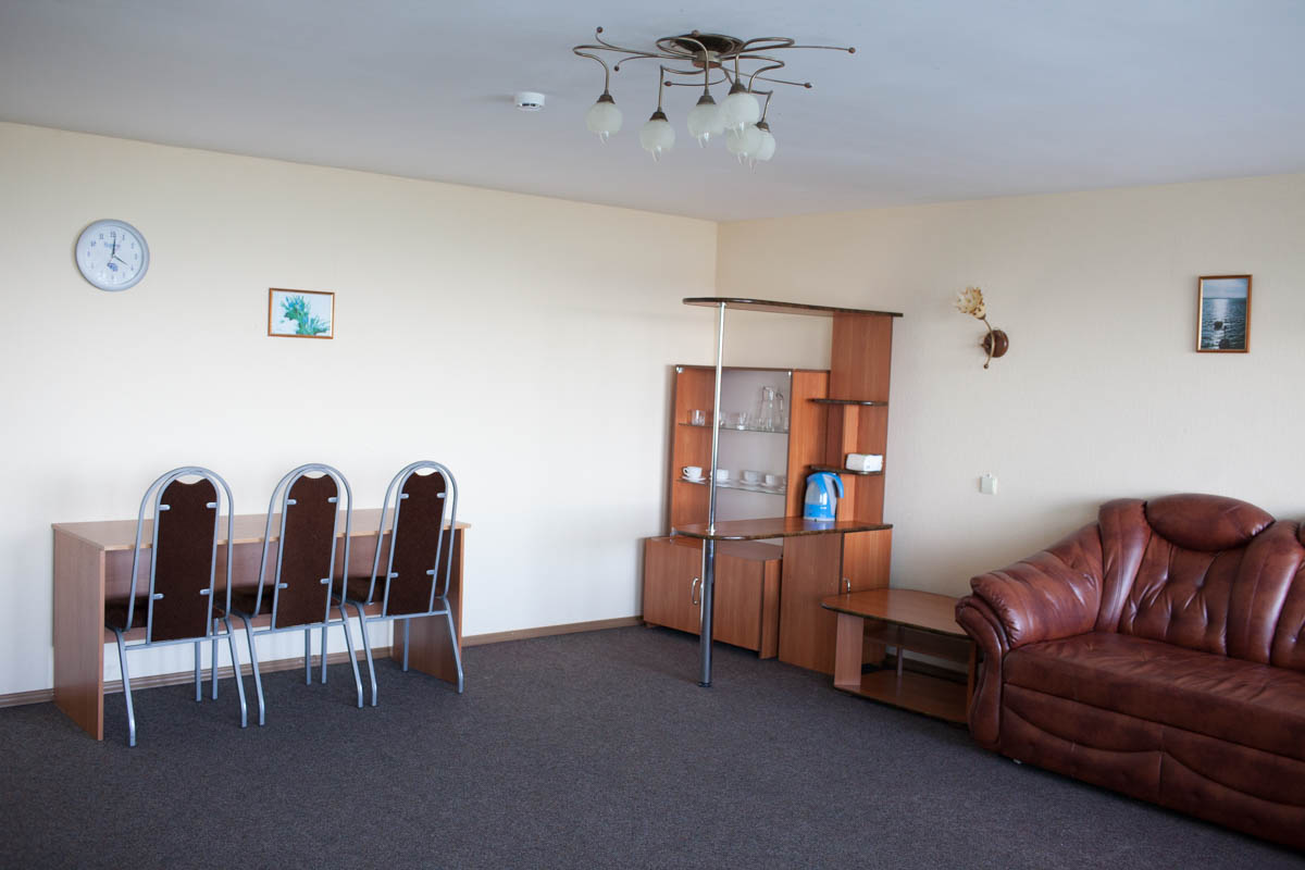 Люкс в светлых оттенках интерьера состоит из двух комнат. В нем предусмотрены два основных спальных места и одно дополнительное (двуспальная кровать и диван).
